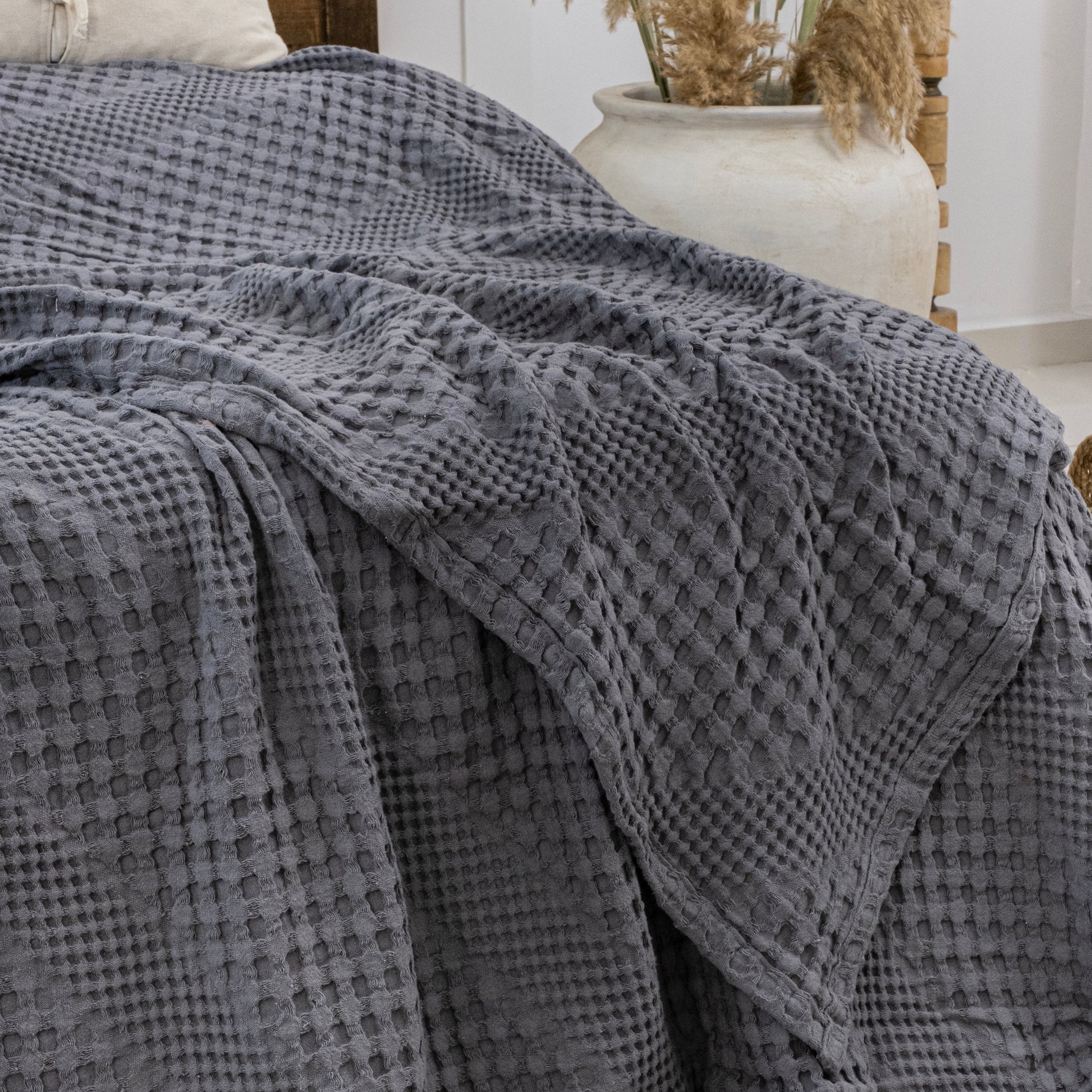 Transform your bedroom or living room into a cozy oasis with our King Size Bed Throw. Made from 100% organic cotton, this soft and breathable blanket is perfect for year-round use. Hypoallergenic and temperature-regulating, it's gentle on sensitive skin and pet-friendly. Measuring 220x250cm, it's large enough for a super king bed or 3-seater sofa. Machine washable and reversible, this stylish grey bedspread is a must-have for any home. Upgrade your home décor with Milam London's Joanna Collection.