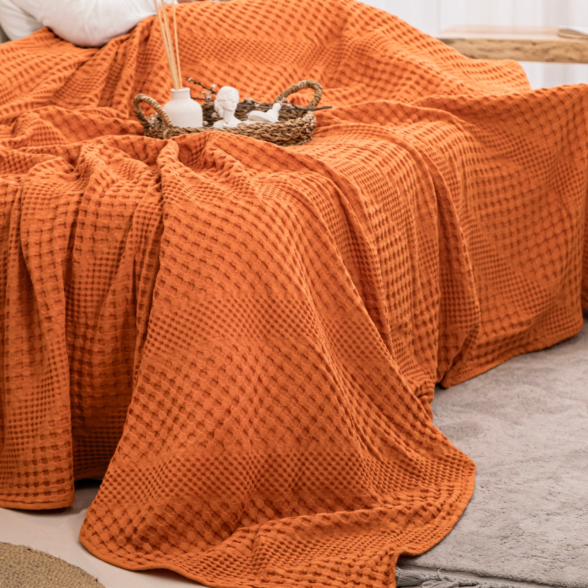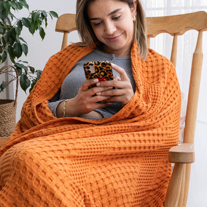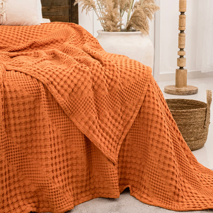 Indulge in luxurious comfort with our Orange Soft Cotton Throw Blanket. Made from 100% organic cotton, this double bedspread is hypoallergenic and prewashed for durability. Its reversible design and generous size of 170 x 250 cm make it perfect for sofas, double beds, and large 2-seater sofas. Machine washable and temperature-control, it's the perfect addition to any modern home decor. Experience the softness and lightweight feel of organic cotton with our stylish and versatile throw.