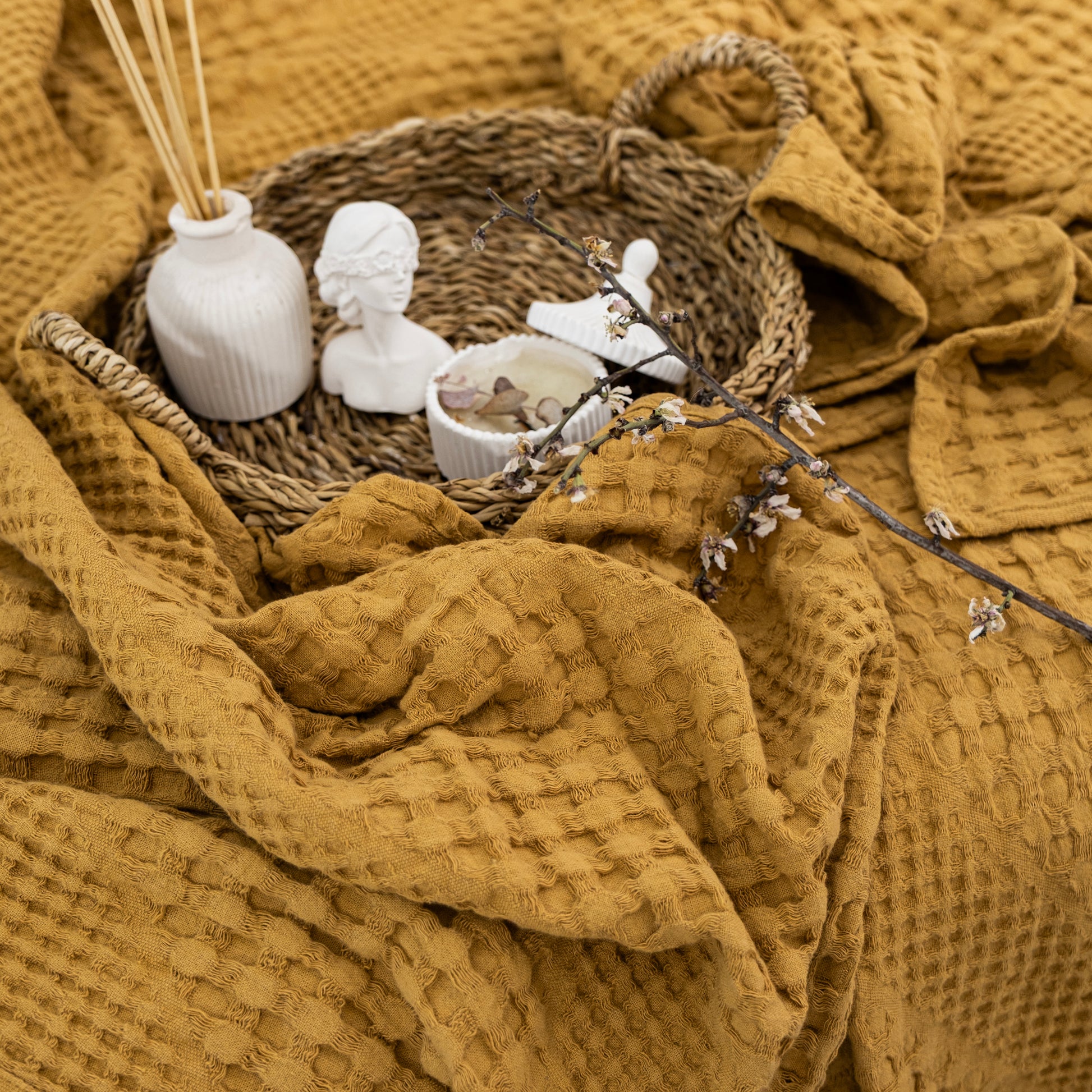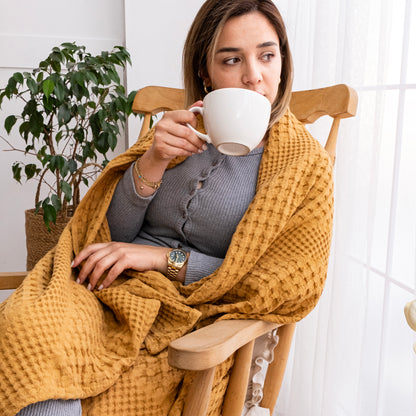 Indulge in luxurious comfort with our Mustard Soft Cotton Throw Blanket. Made from 100% organic cotton, this double bedspread is hypoallergenic and prewashed for durability. Its reversible design and generous size of 170 x 250 cm make it perfect for sofas, double beds, and large 2-seater sofas. Machine washable and temperature-control, it's the perfect addition to any modern home decor. Experience the softness and lightweight feel of organic cotton with our stylish and versatile throw.